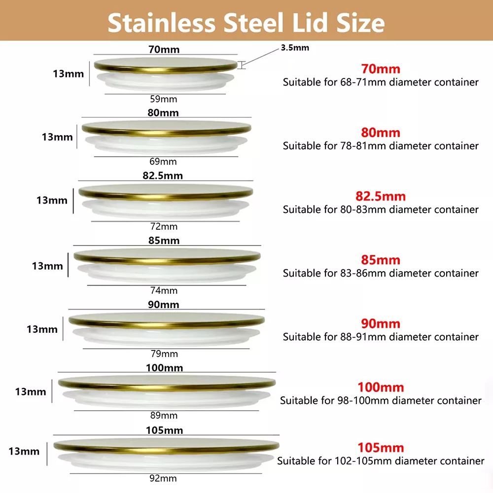 Capacele noastre de borcan cu oțel inoxidabil de imprimare a ecranului sunt disponibile într -o varietate de dimensiuni, toate cu o înălțime totală de 13 mm. Dimensiunile specifice și deschiderile de containere compatibile sunt prezentate mai jos: